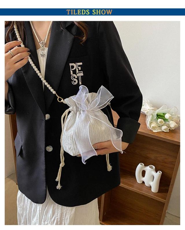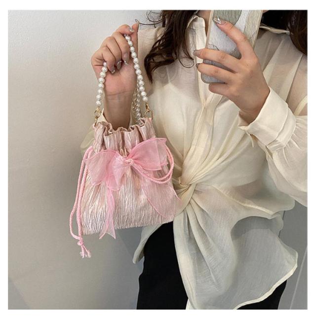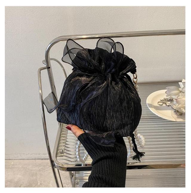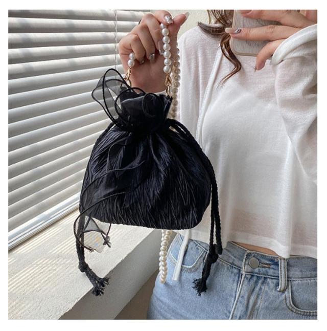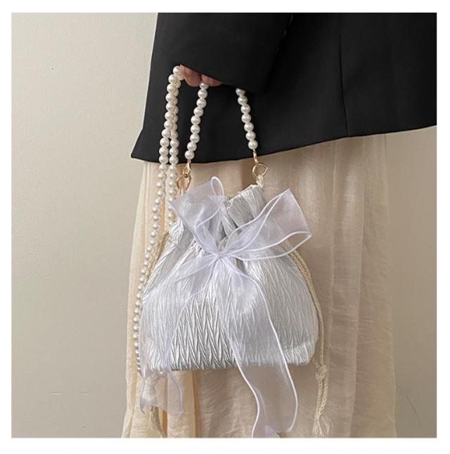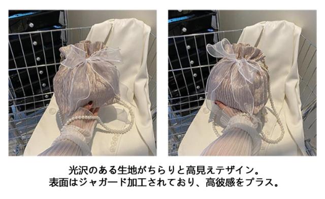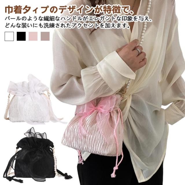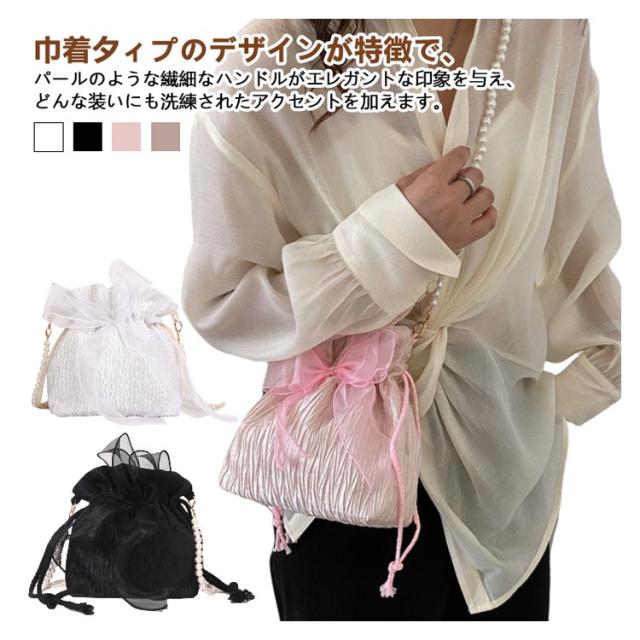 | 巾着夕ィプのデザインが特徴で、パールのような繊細なハンドルがエレガントな印象を与え、どんな装いにも洗練されたアクセントを加えます。 コンパクトな見た目ながら、普段持ち歩くものを十分に収納できるサイズ。 日常使いから特別な日まで幅広く活躍します。 小さな見た目で必需品が十分入るちょうどいいミニバッグです。 光沢のある生地がちらりと高見えテザイン。表面はジャガ一ド加工されており、高彼感をプラス。 | |