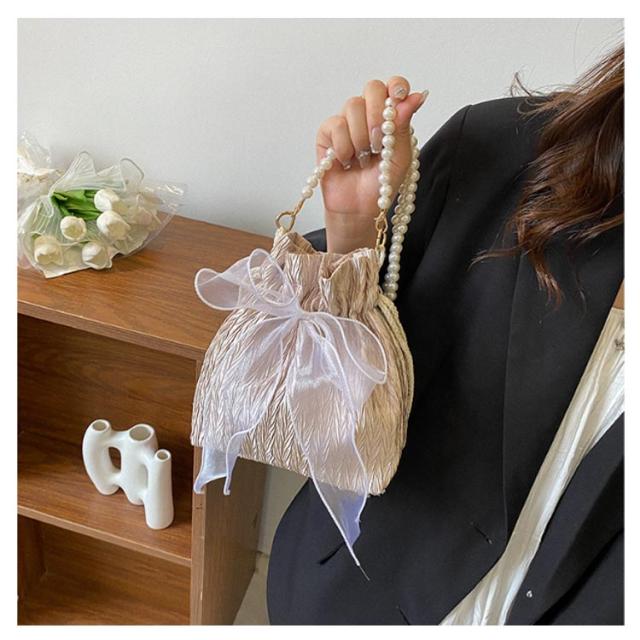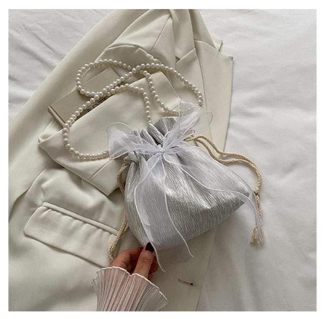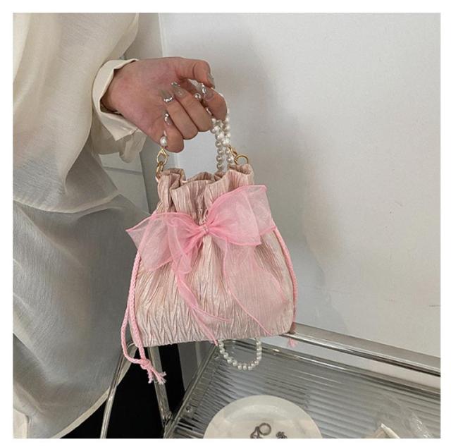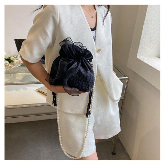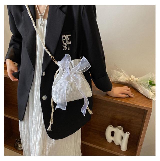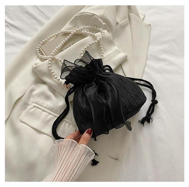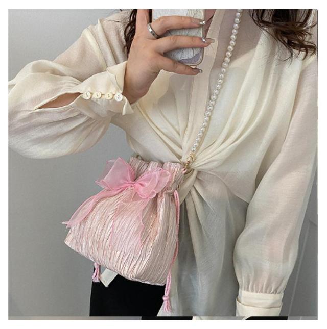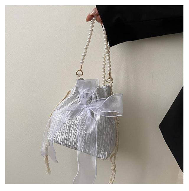 | 巾着夕ィプのデザインが特徴で、パールのような繊細なハンドルがエレガントな印象を与え、どんな装いにも洗練されたアクセントを加えます。 コンパクトな見た目ながら、普段持ち歩くものを十分に収納できるサイズ。 日常使いから特別な日まで幅広く活躍します。 小さな見た目で必需品が十分入るちょうどいいミニバッグです。 光沢のある生地がちらりと高見えテザイン。表面はジャガ一ド加工されており、高彼感をプラス。 | |