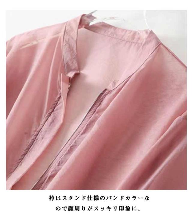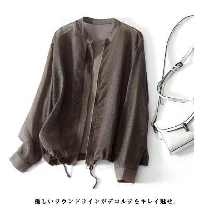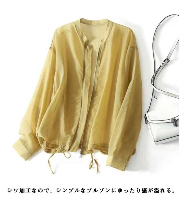 | 夏の冷房対策や日焼け対策に。 暑い季節でも肌をあまり出したくない方にもオススメの、 薄手の軽やかなアウターです。 シワ加工なので、シンプルなブルゾンにゆったり感が溢れる。 衿はスタンド仕様のバンドカラーなので 顔周りがスッキリ印象に。 優しいラウンドラインがデコルテをキレイ魅せ。 それに、全体は同じ素材を使用したので コーデを邪魔しないもポイントです。 裾口部分にドローストリングデザインを施すことで 自分の好みでシルエット調整可能。 透け感がありながら紫外線をカットしてくれる。 サラッとした素材なので、肌ばなれも抜群。 1枚着るだけで、紫外線対策ができる。 | |