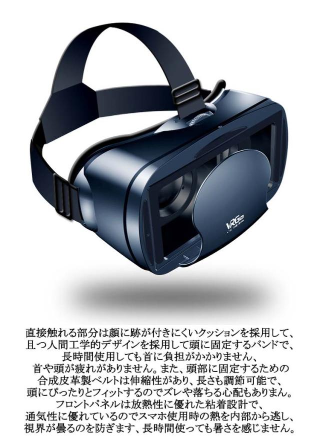 | 【5〜7インチ幅広い機種対応】 最新iPhoneと Android にも問題なく対応! 本体で映画の停止/再生/音量+/-/電話を受けるなどを操作可、800°以下の近視に適用、取り外す可能のフロントパネルで放熱性優れた、1080PHD高画質、120度の広い視野角、 5〜7インチスマホに対応、非球面光学レンズを採用、瞳孔と焦点距離を別に調節でき、全部言ったの性能を含めて、お客様に絶妙な3D映像や立体感のある360度動画を 提供できます。家にまるで映画館のスクリーンで見ているのような映像を楽しむことができます。 このVRヘッドセットはアップグレードされたレンズを使用し、視野角の広さの範囲は120度で、視野が広く、映像をより鮮明にして、360°全方位の視角で、まるで本物の空間にいるかのような疑似体験ができます。そのほか、ブルーライトカット機能がありますので、磁放射線防護機能がついているので、眼精疲労が軽減されます。 120度の広い視野角を採用しており、首を大きく回さなくても仮想世界を見渡すことが可能です。VRに最適化された1080PHD画質レンズにより、リアルで臨場感たっぷりのVR映像が楽しめます。 瞳孔距離や焦点距離を簡単に調節できますので、裸眼視力が悪い方はメガネがなくても裸眼でくっきりとした映像を楽しめます(近視800度以下)メガネを装着したままVRゴーグルを着用できるので、メガネをかけている方もVRの世界を楽しむことができます。 直接触れる部分は顔に跡が付きにくいクッションを採用して、且つ人間工学的デザインを採用して頭に固定するバンドで、長時間使用しても首に負担がかかりません、首や頭が疲れがありません。また、頭部に固定するための合成皮革製ベルトは伸縮性があり、長さも調節可能で、頭にぴったりとフィットするのでズレや落ちる心配もありまん。フロントパネルは放熱性に優れた粘着設計で、通気性に優れているのでスマホ使用時の熱を内部から逃し、視界が曇るのを防ぎます、長時間使っても暑さを感じません。 | |