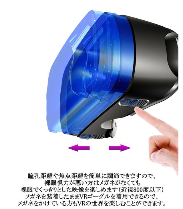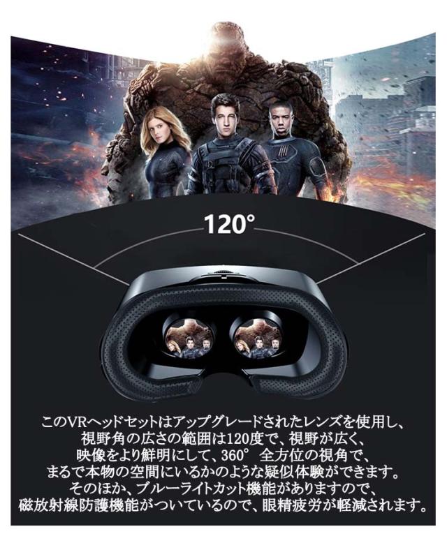 | 【5〜7インチ幅広い機種対応】 最新iPhoneと Android にも問題なく対応! 本体で映画の停止/再生/音量+/-/電話を受けるなどを操作可、800°以下の近視に適用、取り外す可能のフロントパネルで放熱性優れた、1080PHD高画質、120度の広い視野角、 5〜7インチスマホに対応、非球面光学レンズを採用、瞳孔と焦点距離を別に調節でき、全部言ったの性能を含めて、お客様に絶妙な3D映像や立体感のある360度動画を 提供できます。家にまるで映画館のスクリーンで見ているのような映像を楽しむことができます。 このVRヘッドセットはアップグレードされたレンズを使用し、視野角の広さの範囲は120度で、視野が広く、映像をより鮮明にして、360°全方位の視角で、まるで本物の空間にいるかのような疑似体験ができます。そのほか、ブルーライトカット機能がありますので、磁放射線防護機能がついているので、眼精疲労が軽減されます。 120度の広い視野角を採用しており、首を大きく回さなくても仮想世界を見渡すことが可能です。VRに最適化された1080PHD画質レンズにより、リアルで臨場感たっぷりのVR映像が楽しめます。 瞳孔距離や焦点距離を簡単に調節できますので、裸眼視力が悪い方はメガネがなくても裸眼でくっきりとした映像を楽しめます(近視800度以下)メガネを装着したままVRゴーグルを着用できるので、メガネをかけている方もVRの世界を楽しむことができます。 直接触れる部分は顔に跡が付きにくいクッションを採用して、且つ人間工学的デザインを採用して頭に固定するバンドで、長時間使用しても首に負担がかかりません、首や頭が疲れがありません。また、頭部に固定するための合成皮革製ベルトは伸縮性があり、長さも調節可能で、頭にぴったりとフィットするのでズレや落ちる心配もありまん。フロントパネルは放熱性に優れた粘着設計で、通気性に優れているのでスマホ使用時の熱を内部から逃し、視界が曇るのを防ぎます、長時間使っても暑さを感じません。 | |