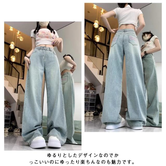 ワイドパンツ おしゃれ レディース ハイウエスト かわいい ボトムス デニム リボン ジーンズ ロングパンツ カジュアル デニムパンツ 春夏 大きいサイズ おしゃれ 春夏 秋冬 デニム シンプル 脚長効果 ゆったり 体型カバー 大人女性