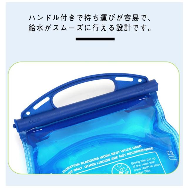 | ランニングバッグ 給水式は、アウトドア活動に最適なハイドレーションバッグです。 1.5L、2L、3Lの容量から選べ、登山やランニング、ウォーキング、マラソンなど多様なシーンで活躍します。 ハンドル付きで持ち運びが容易で、給水がスムーズに行える設計です。 耐久性に優れた素材を使用し、長時間の使用でも安心して水分補給が可能です。 トレーニングやアウトドアでの水分管理に最適なこのバッグで、快適な活動をサポートします。 サイクリング・山登り・ロッククライミング・ランニング・マラソンなど様々な用途にご使用頂けるハイドレーションパックです。 水分補給の為に立ち止まったりせず、運動しながら飲むことができます。 また、非常時、災害時の際に役立つ水袋となります。 | |