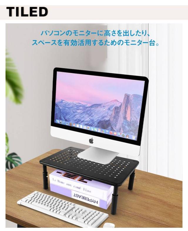 | 目線が上がって操作がしやすい!モニター台 高さ3段階調整 パソコンのモニターに高さを出したり、スペースを有効活用するためのモニター台。 押すだけで三段高さ調節出来!10cm・12cm・14cmの3段階で高さが変えられて、活用範囲が広い。 頑丈なスチール製です。耐荷重20kgで、しっかり物を支えます。ゴム脚なので、設置面を傷つけません。 ノートパソコンなどに最適な、通気性と放熱性の高い天板です。天板にはペントレーとして使える溝もあります。 ディスプレイ下のスペースには、未使用時のキーボードやマウスが格納可能。机上で使う小物類やキーボードなどの周辺機器もすっきりと収納出来ます。 また水濡れにも強く、飲み物をこぼしてしまっても慌てる必要はありません。軽く拭き取るだけと手入れも簡単です。 | |
