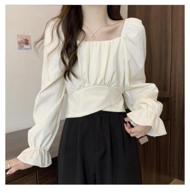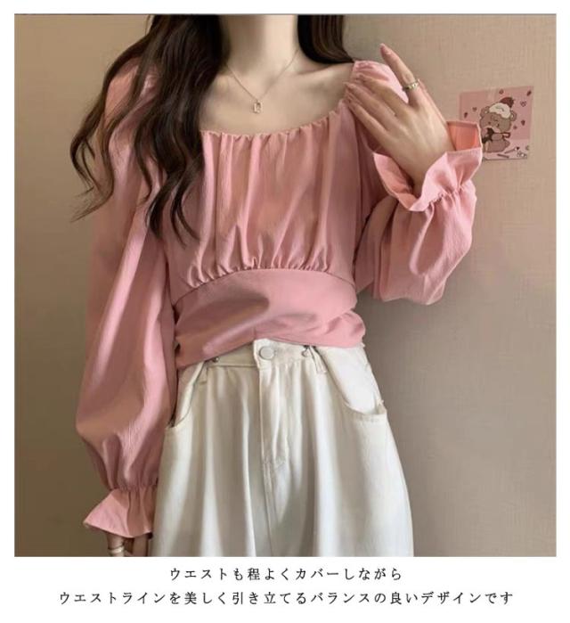 袖あり トップス シフォン ショート丈 萌袖 10代 長袖 パフスリーブ ブルー シャーリングブラウス トップス フリルブラウス シャーリングブラウス 20代 30代 きれいめ かわいい ホワイト ウエストマーク ピンク ブラック グリーン