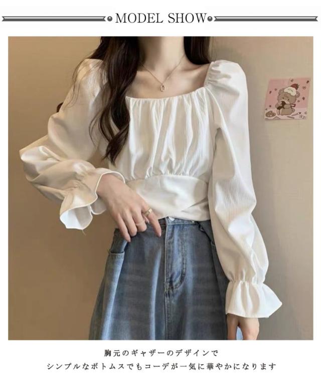 パフスリーブ レディース 20代 袖あり シャーリングブラウス シャーリングブラウス シフォン 萌袖 ショート丈 ウエストマーク トップス フリルブラウス 10代 トップス 30代 きれいめ かわいい ホワイト ブルー ピンク ブラック グリーン