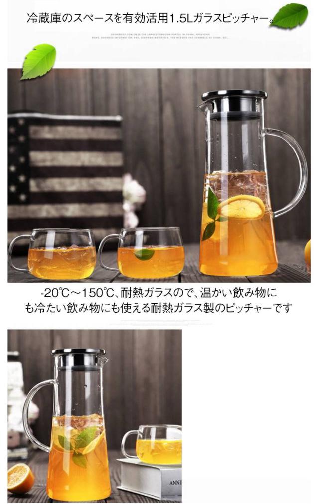 ピッチャー 冷水筒 大容量 耐熱ガラス 麦茶ポット 1.5リットル 冷水ポット 水差し 広口 麦茶ポット 洗いやすい 取っ手付き お茶ポット ティーポット 冷蔵庫 耐冷 1.5L ガラス 水筒 ティーポット お茶 麦茶 ジュース