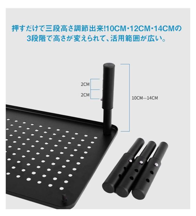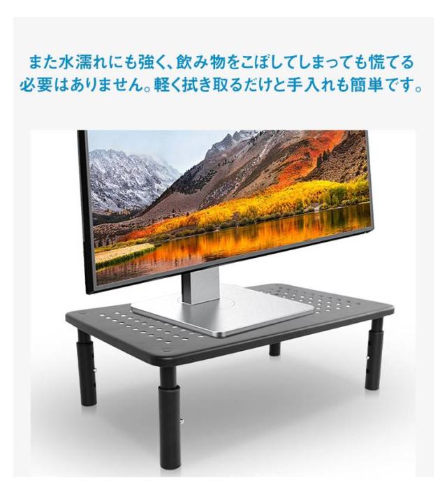 | 目線が上がって操作がしやすい!モニター台 高さ3段階調整 パソコンのモニターに高さを出したり、スペースを有効活用するためのモニター台。 押すだけで三段高さ調節出来!10cm・12cm・14cmの3段階で高さが変えられて、活用範囲が広い。 頑丈なスチール製です。耐荷重20kgで、しっかり物を支えます。ゴム脚なので、設置面を傷つけません。 ノートパソコンなどに最適な、通気性と放熱性の高い天板です。天板にはペントレーとして使える溝もあります。 ディスプレイ下のスペースには、未使用時のキーボードやマウスが格納可能。机上で使う小物類やキーボードなどの周辺機器もすっきりと収納出来ます。 また水濡れにも強く、飲み物をこぼしてしまっても慌てる必要はありません。軽く拭き取るだけと手入れも簡単です。 | |