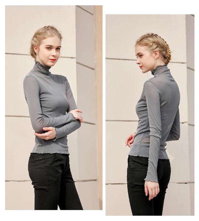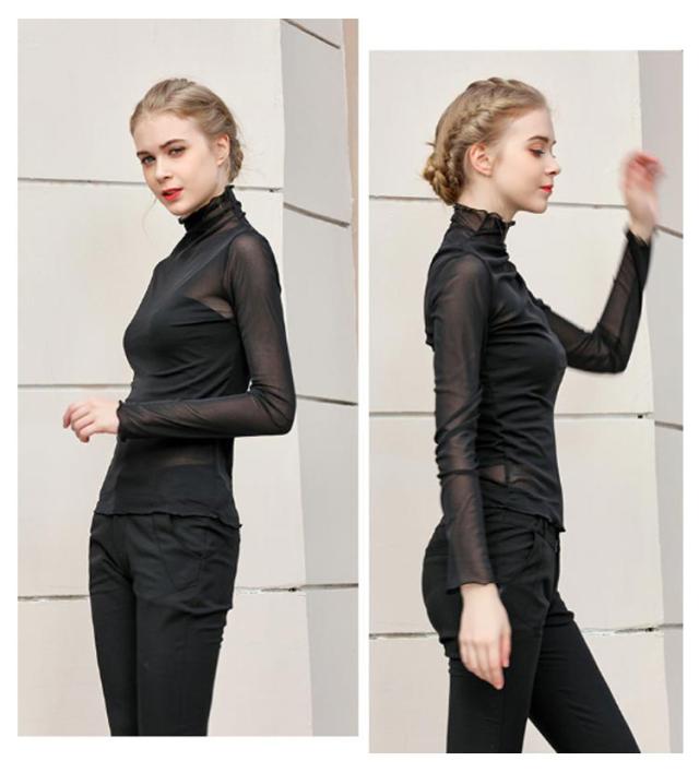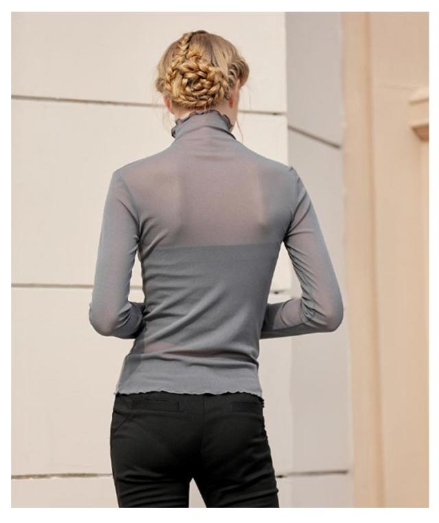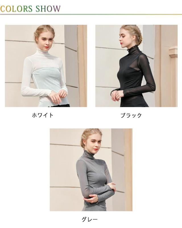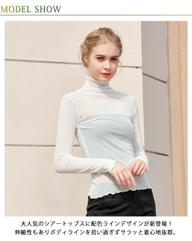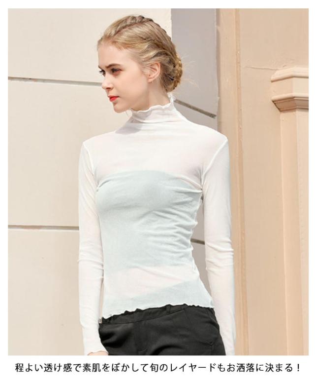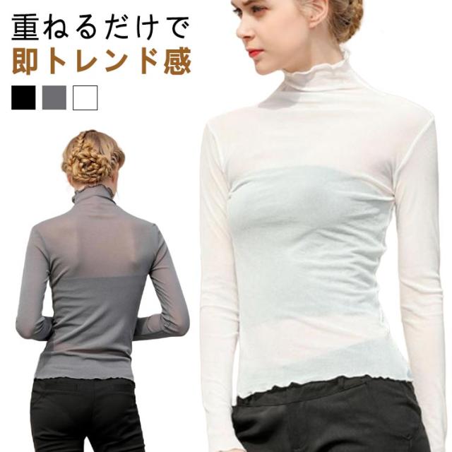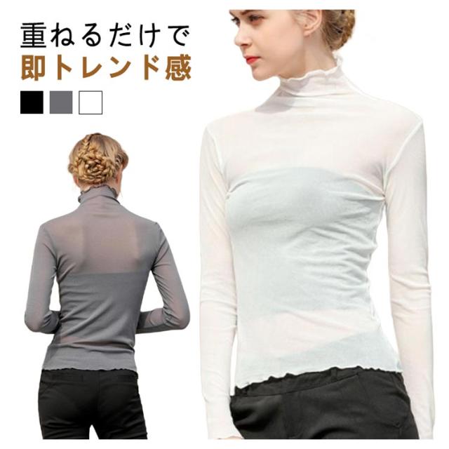 透け感 ハイネック カットソー レディース シアートップス 薄手 シースルー 重ね着 長袖 レイヤード メロウフリル シフォン シースルー 伸縮性 普段着 オフィス 春 夏 秋