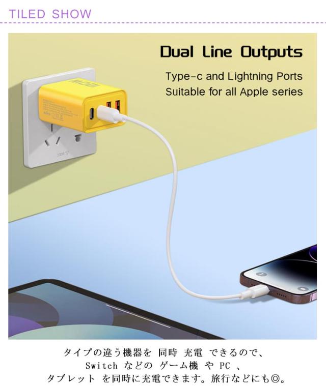 | 2個セット!USBポート x2と タイプC x2が付いた 急速 充電器。 タイプの違う機器を 同時 充電 できるので、Switch などの ゲーム機 や PC 、 タブレット を同時に充電できます。旅行などにも◎。 [コンパクト×おしゃれなデザイン] 小さなカバンにもスッキリ入るコンパクトサイズ&ポップでオシャレなデザインは、見ているだけで元気が出る♪ 機能性もデザインも◎ | |