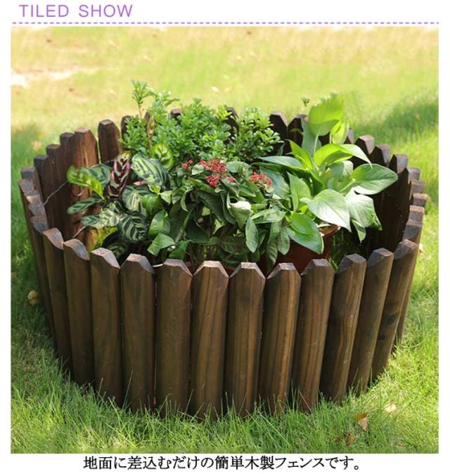 | 長さ120cm 高さ10/15/20/25/30/35/40cm 地面に差込むだけの簡単木製フェンスです。 炭化処理済みの上質なウッド、防腐・防虫で、長くおしゃれにお使いいただけます。 天然木の風合いとシンプルなデザインが、お庭のアクセントになります。 お庭や玄関のプランターの周りに使ったカバー、 花壇の仕切り、ガーデニングのアクセントになるアイテムです。 | |