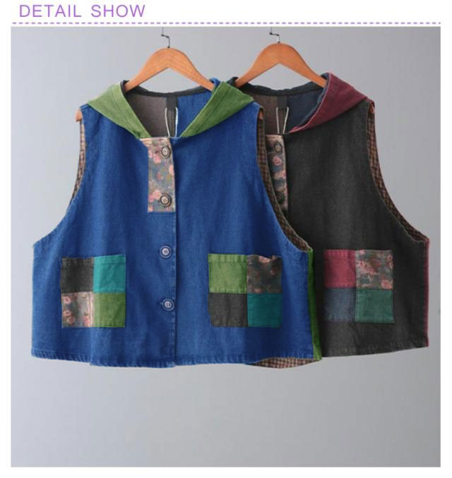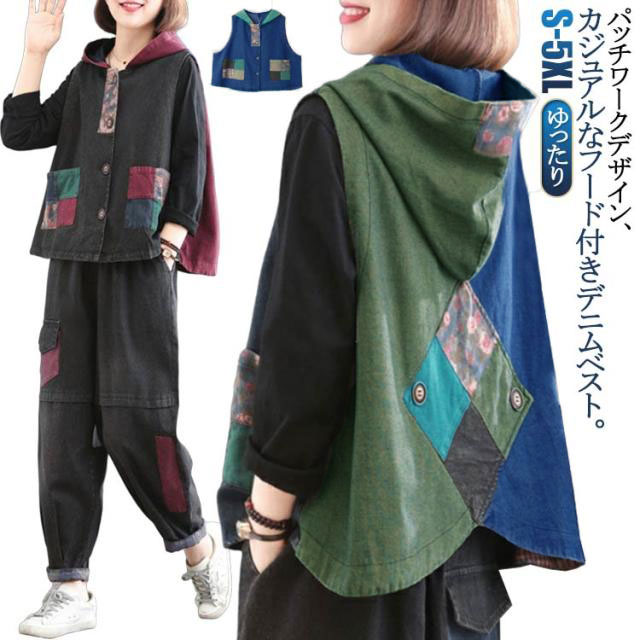 レトロ カジュアル ベスト パッチワーク レディース デニムベスト ライトアウター エスニック フード付き ノースリーブ デニム レイヤード 重ねる ゆったり 羽織り 着やせ 体型カバー ノースリーブ S M L XL 2XL 3XL 4XL