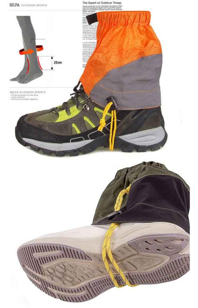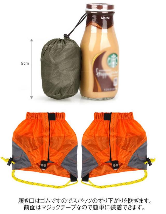 | ハイキング、トレッキングや普段の雨の時期に対応できるショート丈ゲイター。 靴の足首まわりをカバーして雪、雨、砂、小石など異物が靴の中へ侵入するのを防ぎます。 冬の防水や保温にも最適です。 素材は20Dナイロン生地でシリコンコーティングしてあるので水を弾きます。 20Dなので超軽量です。 履き口はゴムですのでスパッツのずり下がりを防ぎます。 裾口は足掛け用紐と靴紐ホックでズレにくいです。 前面はマジックテープなので簡単に装着できます。 | |