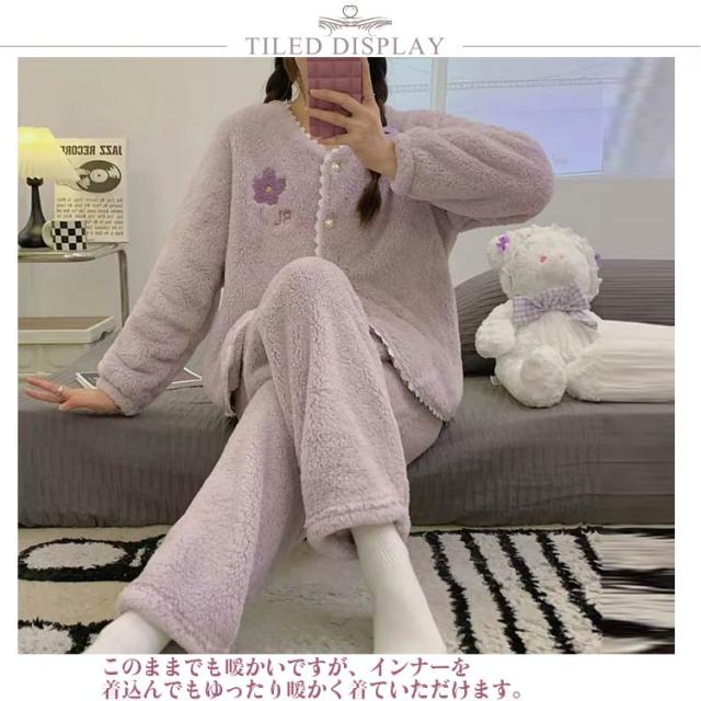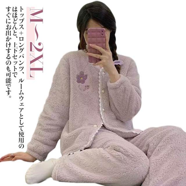 ルームパンツ ふんわり 長袖 ウエストゴム ボア もこもこ 防寒 レディース 秋冬 前開き トップス 起毛 保温 セットアップ 上下セット 部屋着 ゆったり 大きいサイズ パジャマ ロングパンツ かわいい ルームウェア 暖かい ギフト プレゼント