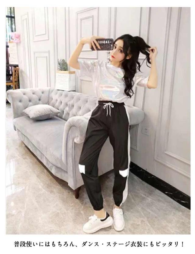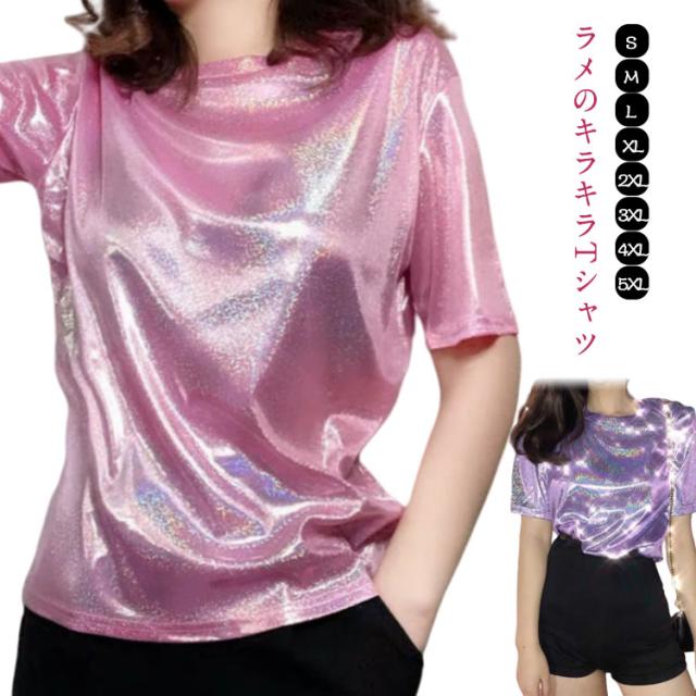 きらきら tシャツ 派手かわ ラミネート クルーネック カットソー ダンス ラメTシャツ メタリック ラメTシャツ おそろい トップス ラメ 衣装 レディース キッズ ジュニア イベント 双子コーデ 半袖 夏 フェス ライブ ヒップホップ ストリート インスタ映え 原宿系