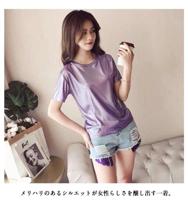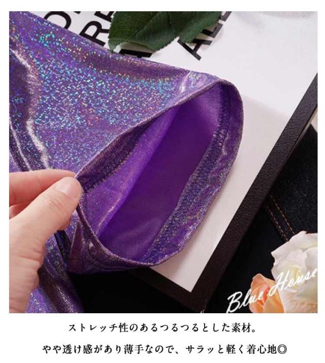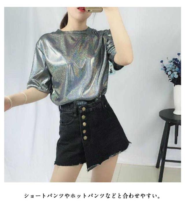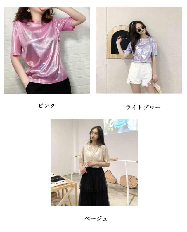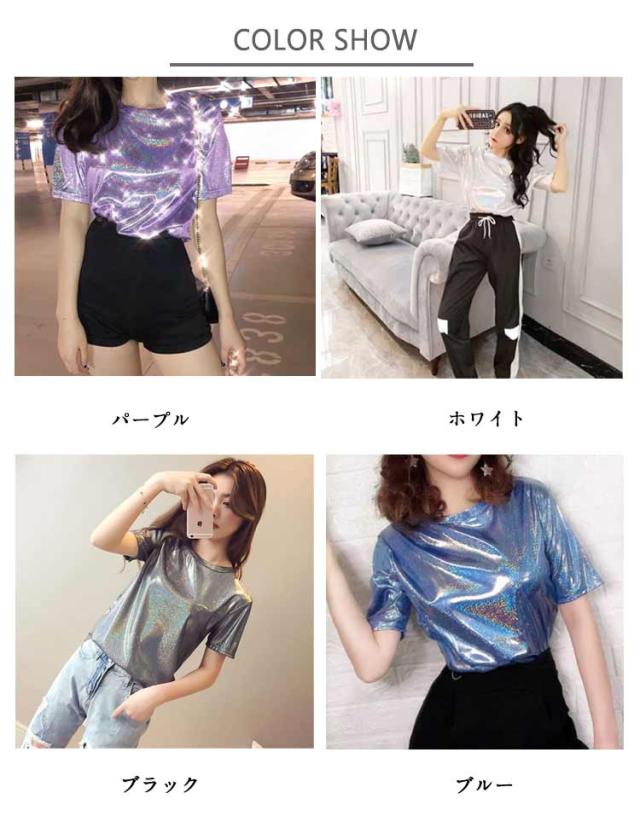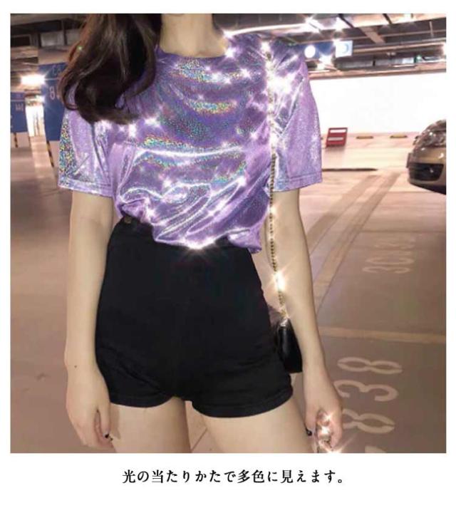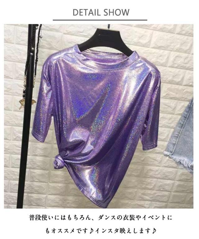 | ラメのキラキラTシャツ 蒸れ感もなく、サラッと軽く薄く着心地良い。 普段使いにはもちろん、ダンス・ステージ衣装にもピッタリ! ショートパンツやホットパンツなどと合わせやすい。 メリハリのあるシルエットが女性らしさを醸し出す一着。 普段使いにはもちろん、ダンスの衣装やイベントにもオススメです♪インスタ映えします♪ ストレッチ性のあるつるつるとした素材。やや透け感があり薄手なので、サラッと軽く着心地◎ 光の当たりかたで多色に見えます。 | |