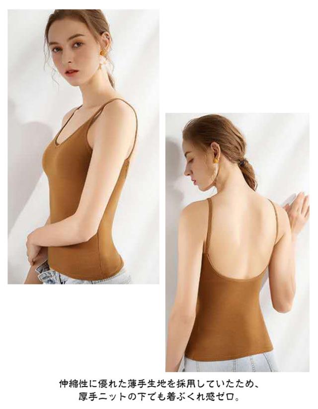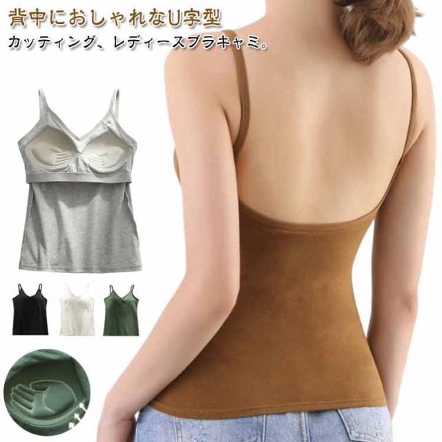 | 背中におしゃれなU字型カッティング、レディースブラキャミ。美シルエットが叶う、盛れるカップ付きバックオープンキャミソール。 ブラの重ね着がいらず、カップ付きで1枚着OK! 肌に優しいコットン素材の生地感にワイヤー無しの仕様! ストレスフリーな着用感を与えまして、動きやすさ的にも申し分なし。 ブラ部分はズレ防止のデザインとなっていて、そして締め付け感もしません。 パーティドレスなど、背中あきトップスを着こなすためのマストアイテム。 伸縮性に優れた薄手生地を採用していたため、厚手ニットの下でも着ぶくれ感ゼロ。 デイリーはもちろん、おうちでのリラックスタイムにも便利なインナーです。 | |