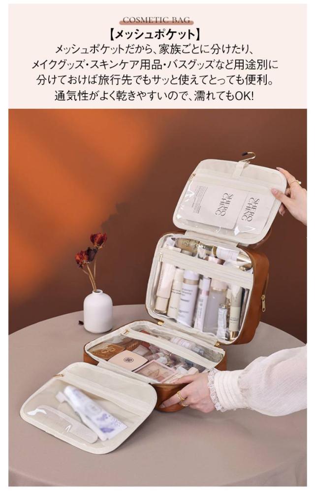 | 吊り下げて使える大容量の洗面ポーチ。 旅先のホテルや旅館の洗面台で使い勝手抜群の便利アイテムです。 【吊るして使える】 フック付きで、タオルハンガーやドアノブ、シャワーカーテンバーなどいろんな場所に掛けて使えます! 吊り下げて使えるので、洗面台がごちゃごちゃせず、すっきり。 中身も一目で見やすく使い勝手抜群です。 【メッシュポケット】 メッシュポケットだから、家族ごとに分けたり、メイクグッズ・スキンケア用品・バスグッズなど用途別に分けておけば旅行先でもサッと使えてとっても便利。 通気性がよく乾きやすいので、濡れてもOK! 【まとめてコンパクトに収納】 洗面用具をすべてコンパクトにまとめられます。 さらに、持ち手つきなので、移動や出し入れもラクラク。 スクエア型なので、スーツケースにもぴったり入ってバッキングもしやすいです。 | |