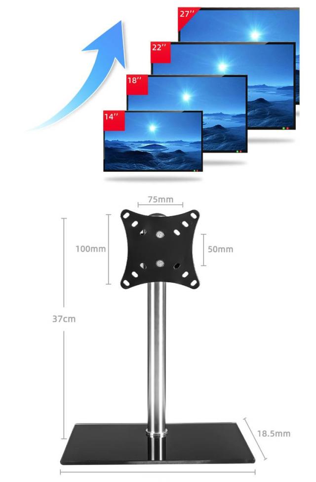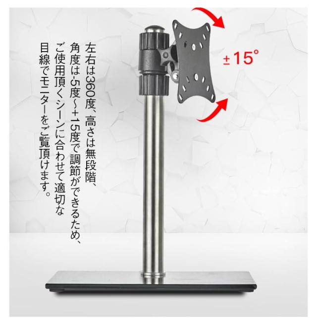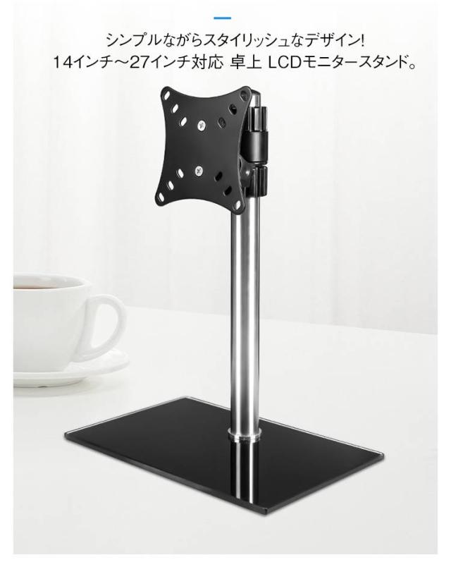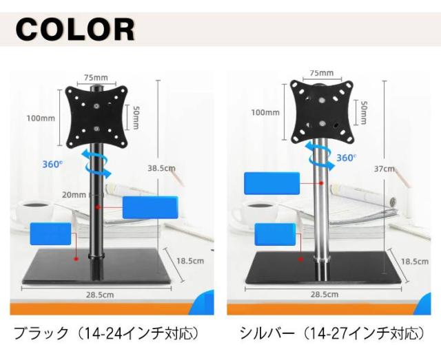 | サイズについての説明 | サイズ:ブラック(14-24インチ対応):高さ38.5×横幅28.5×奥行18.5cm対応モニターサイズ:14〜24インチ調節可能角度:-5度/+15度 左右360°の角度調節が可能台座部分に強化ガラス厚さ約8mmVESA規格対応サイズ:50×50、75×75、100×100mm耐荷重:8kgシルバー(14-27インチ対応):高さ37×横幅28.5×奥行18.5cm対応モニターサイズ:14〜27インチ調節可能角度:-5度/+15度 左右360°の角度調節が可能VESA規格対応サイズ:50×50、75×75、100×100mm耐荷重:8kg※サイズ計測には誤差が生じます。 |