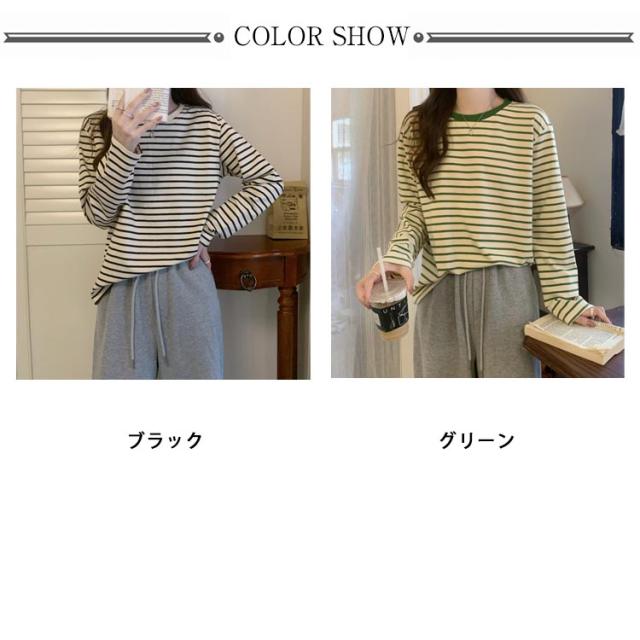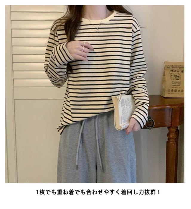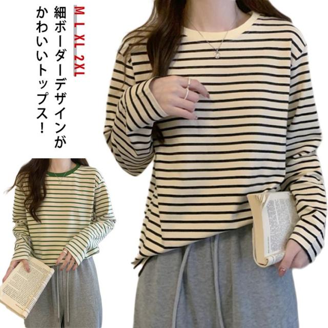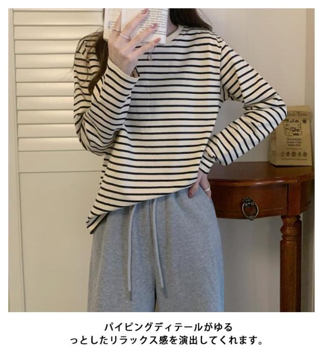 ラウンドネック パイピング ボーダー レディース トップス カットソー 通勤 細縞 長袖 重ね着 ロングTシャツ ロンt 細ボーダー 着回し ティーシャツ 長袖 tシャツ ロング シンプル パイピング 通学 ブラック