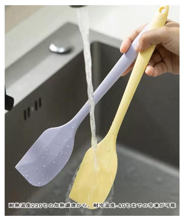 | 【シリコンヘラ】 環境保護、非毒性、非スティック、耐久性、安全な100%食品グレードのシリコーン素材使用 全体はマットな質感で、先端はつや仕上げ 柄とへらが一体成型で、継ぎ目がないで汚れが溜まらず衛生に使える 柄には引っかけるのに便利な穴付きなので収納もしやすい 耐熱温度220℃の加熱調理から、耐冷温度-40℃までの冷凍が可能 | |