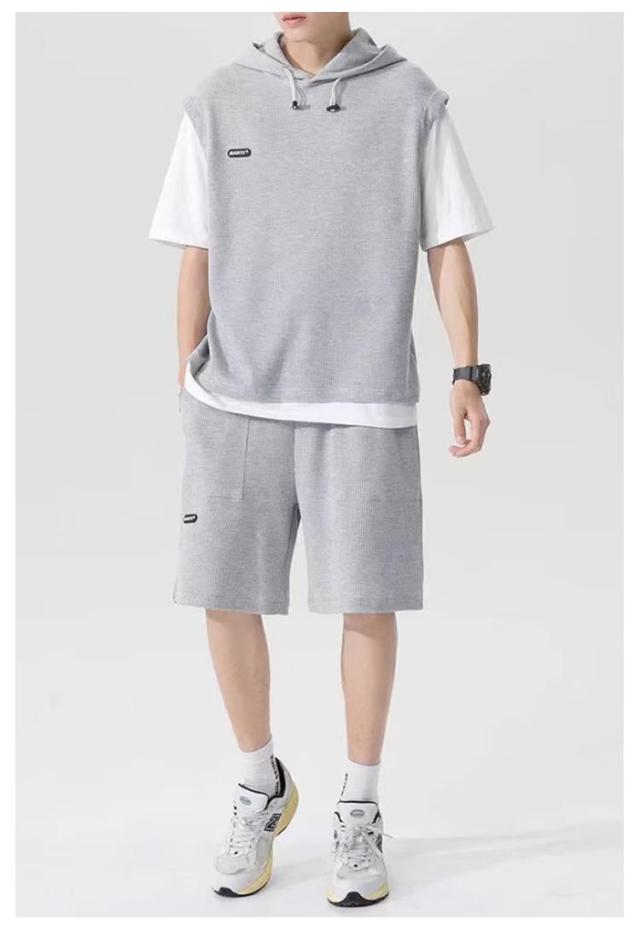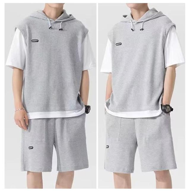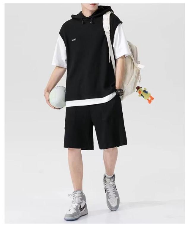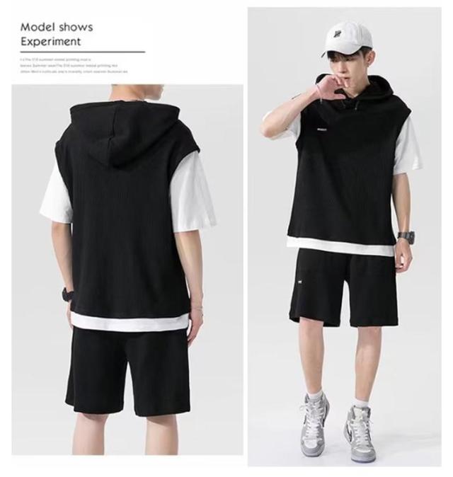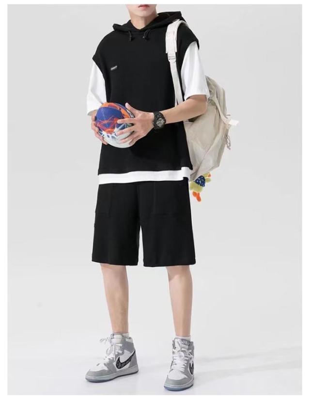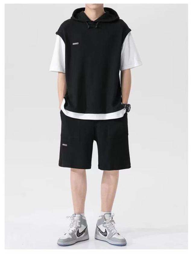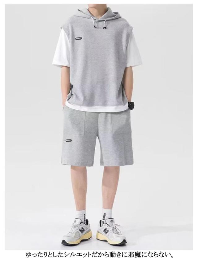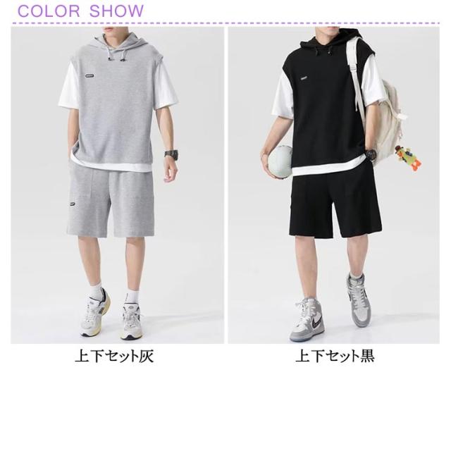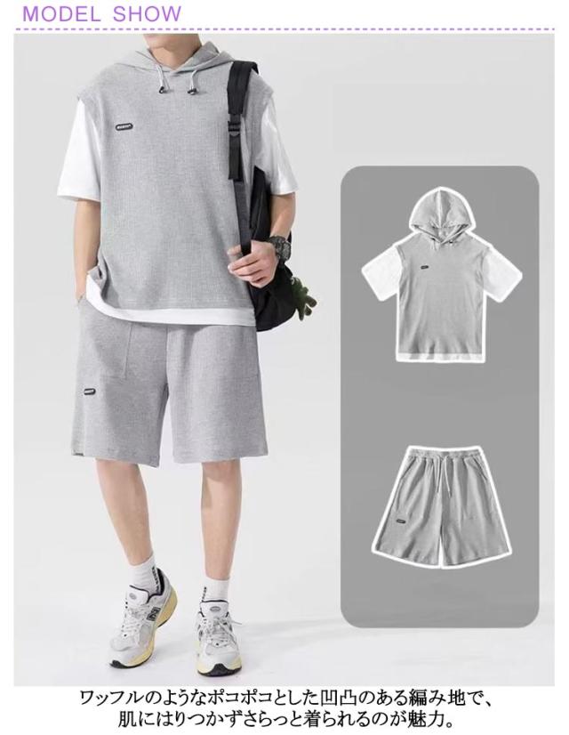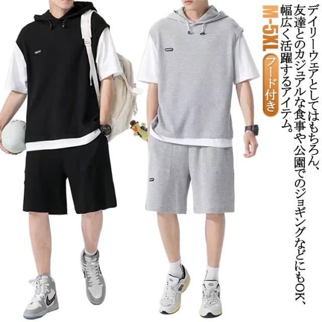 カットソー 重ね着風 スポーツウエア メンズ 夏用 フード付き 上下セット カジュアル 半袖パーカー 重ね着風 プルオーバー ショートパンツ 2点セット 大きサイズ ゆったり 半ズボン