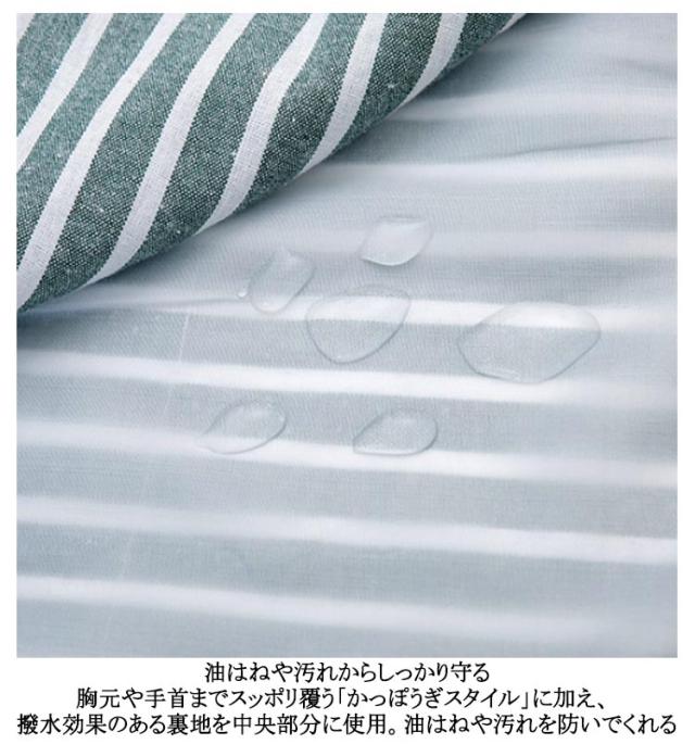 | 毎日の家事に大活躍♪かっぽうぎスタイルのエプロン 油はねや汚れからしっかり守る 胸元や手首までスッポリ覆う「かっぽうぎスタイル」に加え、 撥水効果のある裏地を中央部分に使用。油はねや汚れを防いでくれる 背面は2ヶ所の後ろ結び紐が付属。 初めから結んでおけば、被るだけでOKの簡単仕様。 袖口にゴムが入っているから、袖まくりがラクラク! | |