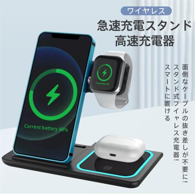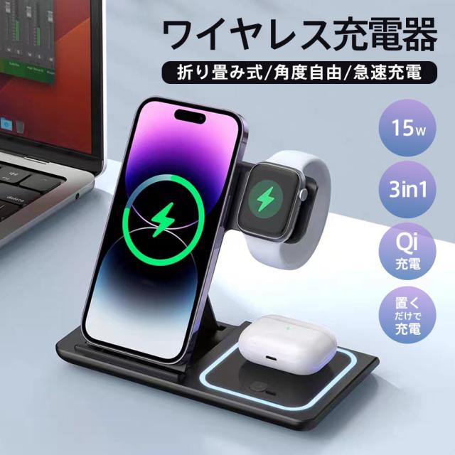 ワイヤレス充電器 ワイヤレス充電スタンド 3in1 15w iPhone 折り畳み ワイヤレスチャージャー Airpods Qi急