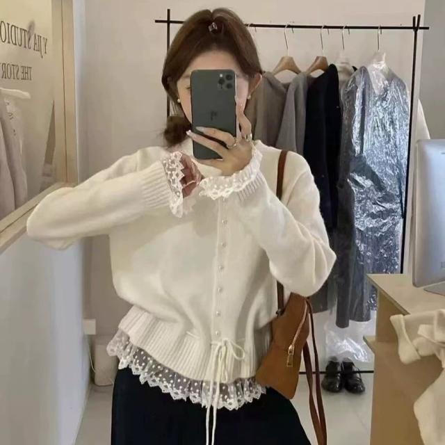 レース切り替えデザインがかわいいニットカーディガン。