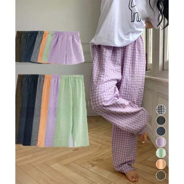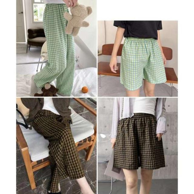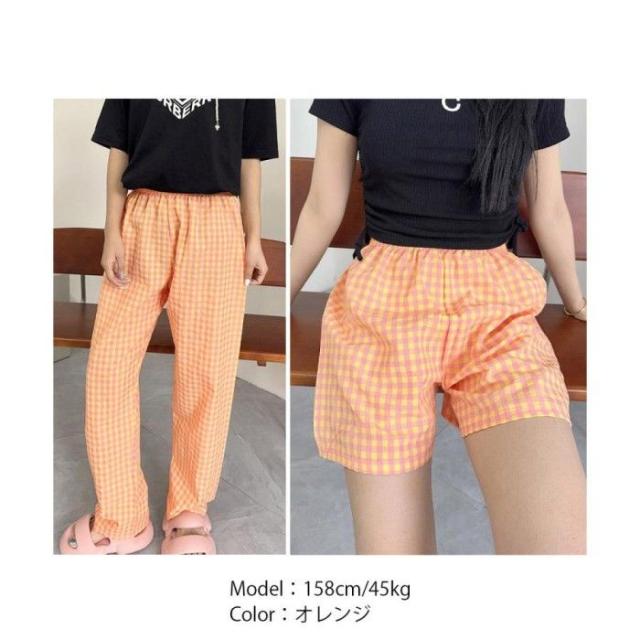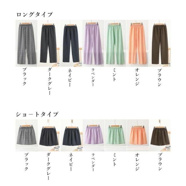 丈選べる チェック柄ロングパンツ涼しい 格子柄ショートパンツ ウエストゴム 着やせワイドパンツ 体型カバー 部屋着パンツ