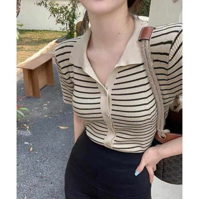 ニットtシャツ 薄手サマーニット 襟付きカットソー カジュアル夏服 着やせニット Vネックニットトップス 前開き 韓国風