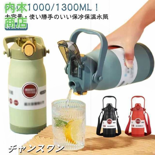 | 680/1000/1300ML!大容量・使い勝手のいい保冷保温水筒 ハンドルとショルダーストラップ付きで、手提げしたり、斜め掛けたりできるから、学校、外出やアウトドア時にとても便利。 外気の熱の影響を受けにくい真空二重構造、長時間氷をキープします。 ロックを解除し、ワンタッチオープンで簡単にふたを開けることができます。フタの裏面にシリコーンのパッキン付きなので、しっかり閉まって、中身がこぼれにくい。 そのまま飲めることもできるし、ストローを利用することもできます。スポーツや部活、アウトドアに最適なスポーツジャグです。 大きなな口径、大きめ氷もラクラク入ります。 各パーツは取り外し可能、いつも清潔に。 | |