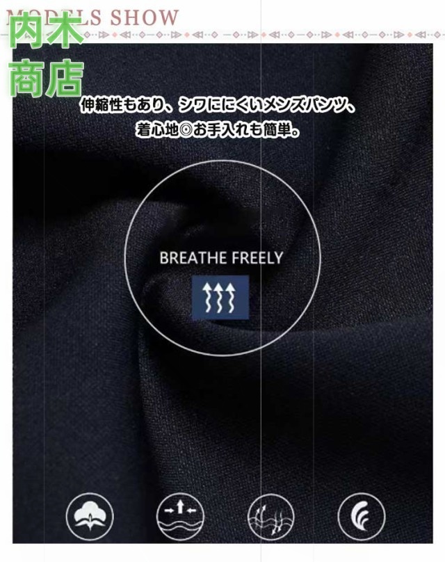 | 伸縮性もあり、シワににくいメンズパンツ、着心地◎お手入れも簡単。 360°方向に伸びる、伸縮性抜群の新素材ハイテンションストレッチを表地に使用しました。 軽くて薄い、ひんやり接触冷感素材、蒸し暑い季節も快適な着用感。 仕事、通勤におすすめのメンズスラックス! | |