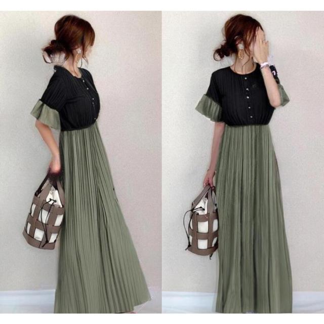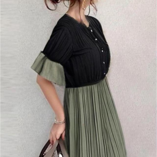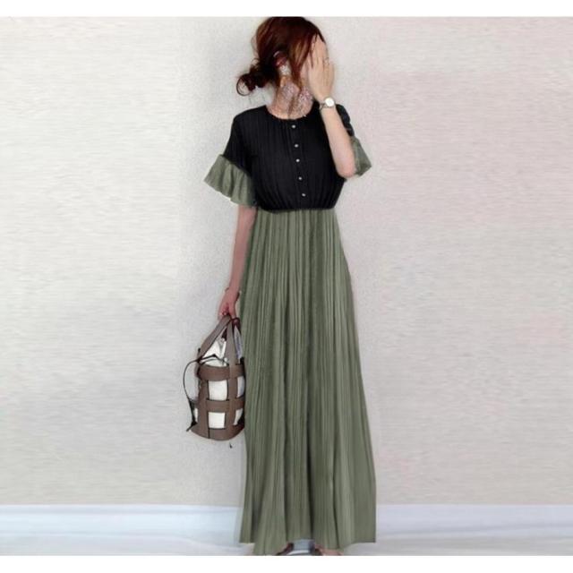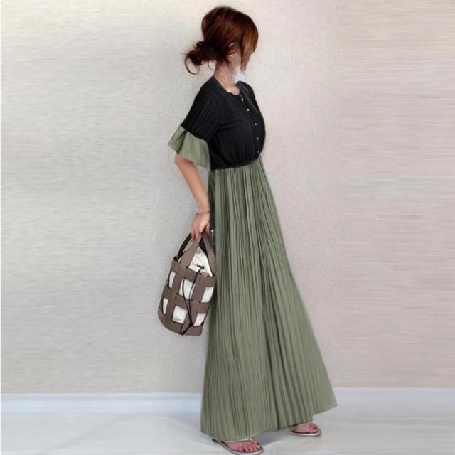 ワンピース ドッキング パフスリーブ 配色 可愛い プリッツ 半袖 マキシワンピース 切り替え 着痩せ 通勤 通学 春夏 レディース