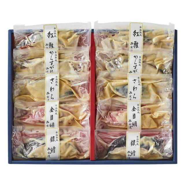 内容:銀だら西京漬け70g×2、さわら西京漬け70g×2、紅鮭西京漬け70g×2、からすがれい西京漬け70g×2、金目鯛西京漬け70g×2