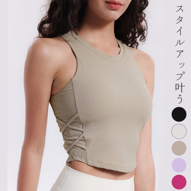 メール便送料無料 ヨガウェア タンクトップ リブ クロップド丈 トップス レディース カップ付き スポーツウェア ホットヨガ フィットネスウェア ピラティスウェア 速乾 吸汗 ストレッチ アメリカンスリーブ サイドレースアップ 裏地付き 部屋着 運動 練習着 無地 オールシーズン 薄手 黒 白