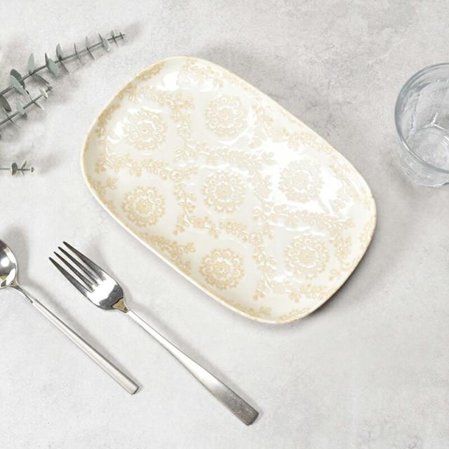 やわらかな長方形のフォルムに、繊細なレース柄をあしらった「ロイヤルレース」シリーズの24cm変形皿。