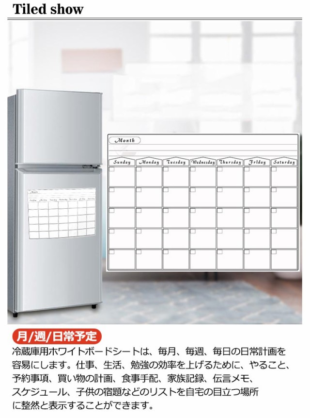 | 磁石で冷蔵庫に貼り付けタイプのホワイトボードシール。【週間予定表/月間予定表】【30*42cm】 【月/週/日常予定】冷蔵庫用ホワイトボードシートは、毎月、毎週、毎日の日常計画を容易にします。仕事、生活、勉強の効率を上げるために、やること、予約事項、買い物の計画、食事手配、家族記録、伝言メモ、スケジュール、子供の宿題などのリストを自宅の目立つ場所に整然と表示することができます。 【書き・消しやすい】高品質のPET材料を採用され、マグネットスケジュールの表面は滑らかで、書きやすい。書き間違えたら付属の消しゴムで簡単に消すことができます。痕跡を残さず、長い間残したインクでも大丈夫です。何度も繰り返して拭いても表面に影響がありません。ご注意:油性ペンを書くときれいに消せないので、専用ペンをおすすめします。長時間インクが残って落ちにくい場合は、水性インクのため、湿らせたタオルで簡単に拭き取ることができます。 製品の表面を傷つけないように、他の化学溶剤を使用しないでください。 【強粘着力・簡単インストール】ホワイトボードシートの裏には0.5 mmの厚さの磁石の薄板を使い、冷蔵庫、オフィス用ホワイトボード、他の鉄製品の表面に丈夫に貼り付けることができます。粘着剤を使用しないので、自由に貼り付けたり、移動したり、何度でも再利用できます。ご注意:貼り付ける前にスチール面かどうかをご確認ください。壁紙面、ガラス、木製など非スチール面にくっつきません。 【広い用途】家族と自宅で使うだけでなく、学校、オフィス、セミナーなどで友達や同僚と共有して使うこともできます。今週の計画、来週の計画、メモを使用して、重要事項を詳細に要約し、毎日の特定の取り決めと組み合わせて、漏れがないようにすることができます。 | |
