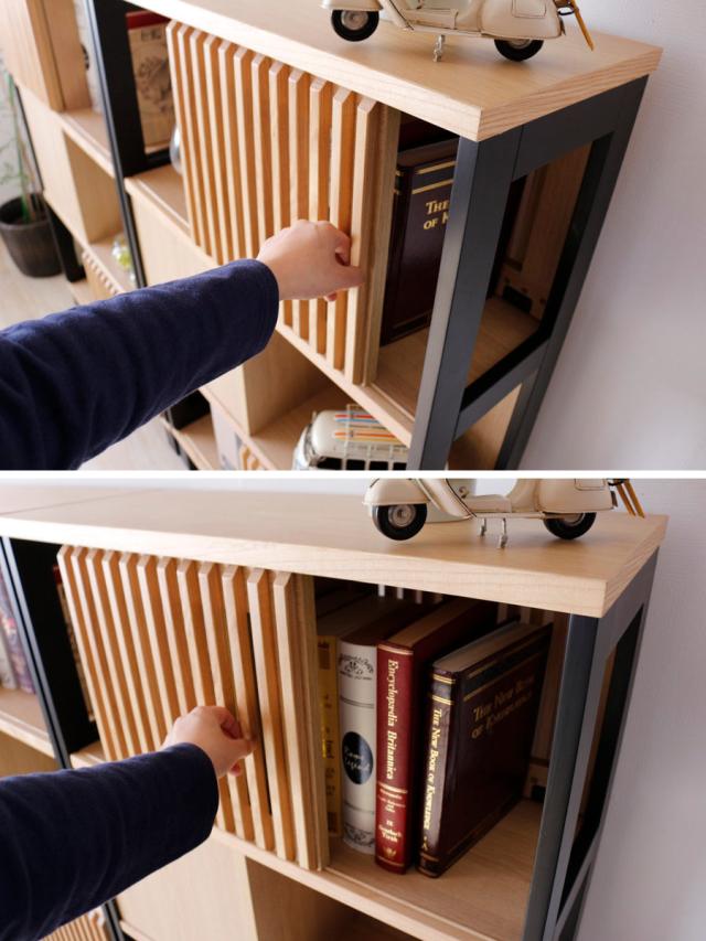 棚はA4サイズに対応しているので、デスクサイドやリビングで雑誌や書類の整理にも最適です。扉のルーバーデザインが、さりげなく中身を隠してくれます。