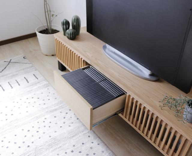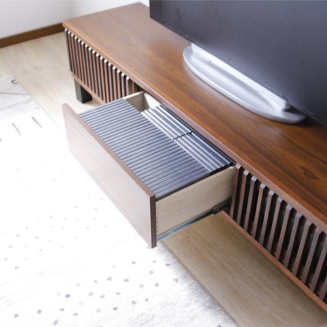 リビング周りの小物やDVDケースの収納に最適な引出しは、フルスライドレール仕様で奥までしっかりと見渡せます。DVDなどをたっぷり収納しても、スムーズに開閉ができます。