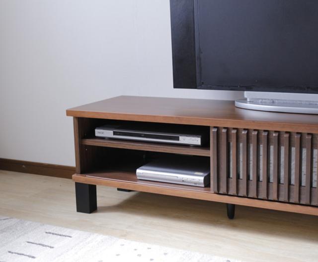 扉は、スペースを取らない引き戸タイプです。棚板は可動式で、お手持ちのAV機器のサイズに合わせて高さを調節できます。取り外せばボックスやルーター等も収納OK。引き戸のルーバー部の内側にはガラスが入っているので、扉を閉めたままでもリモコンの操作が可能です。