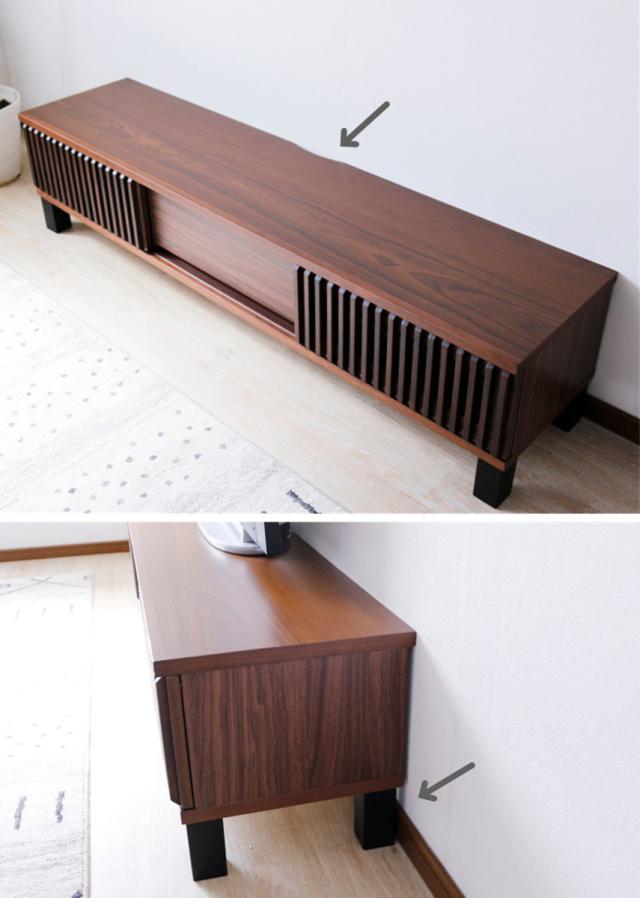 コードを避けられるように、天板後方には切り欠き加工が施されています。また、高めの脚部で幅木を避けることができるので、壁にぴったりと付けて設置できます。