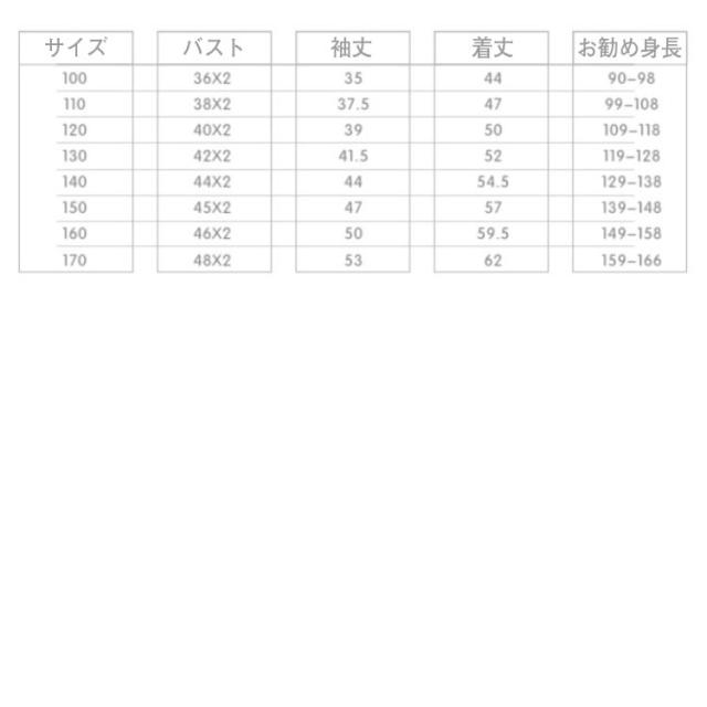 | サイズについての説明 | 【100】胸囲36*2 袖長35 着丈44 参考身長90-98 【110】胸囲38*2 袖長37.5 着丈47 参考身長99-108 【120】胸囲40*2 袖長39 着丈50 参考身長109-118 【130】胸囲42*2 袖長41.5 着丈52 参考身長119-128 【140】胸囲44*2 袖長44 着丈54.5 参考身長129-138 【150】胸囲45*2 袖長47 着丈57 参考身長139-148 【160】胸囲46*2 袖長50 着丈59.5 参考身長149-158 【170】胸囲48*2 袖長53 着丈62 参考身長159-166 ※上記サイズは平置き実寸になります。サイズ表の実寸法は商品によって1-3cm程度の誤差がある場合がございます。 |