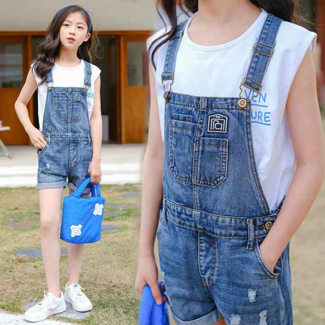 デニム ショートパンツ オーバーオール 女の子 夏 子供服 キッズ デニムパンツ ジーンズ おしゃれ ダメージ 可愛い レトロ サロペット オールインワン 子ども服 110 120 1 ブルー