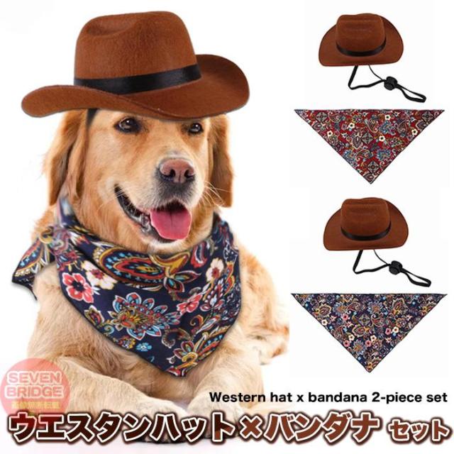 犬 猫 帽子 カウボーイハット バンダナ 2点セット ペット ワンタッチ 犬の帽子 テンガロンハット