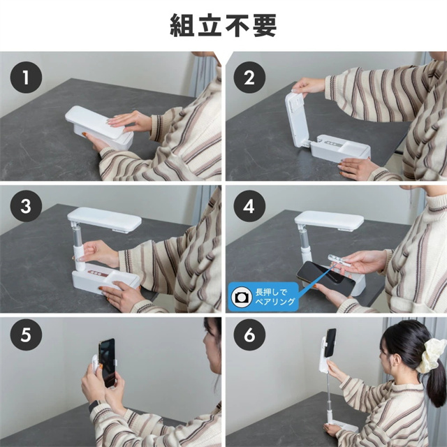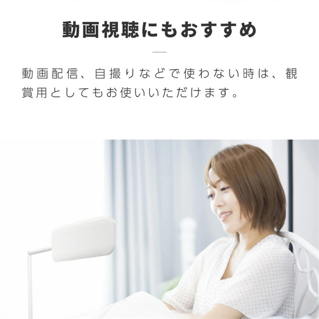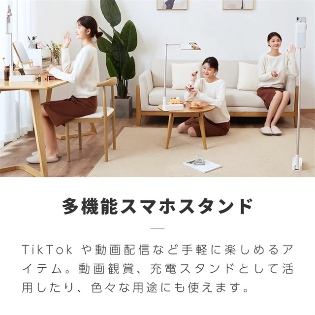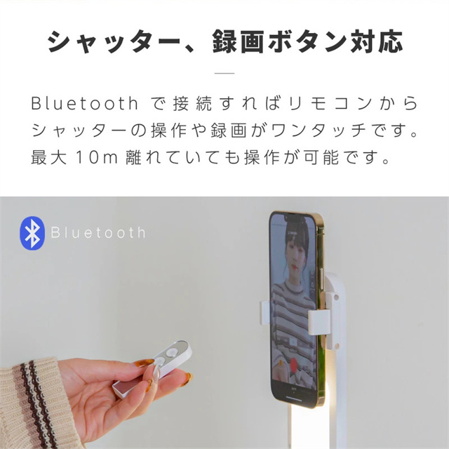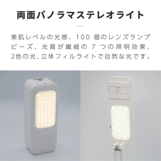 TikTokや動画配信など手軽に楽しめるアイテム。 動画観賞、充電スタンドとして活用したり、色々な用途にも使えます。 充電式なので屋外や出先など電源のない場所でもOK。 最大高さ126cm。アームが90度曲がり、ヘッドが360度回転するので、様々なアングルをすばやく調節することが出来ます。 ヘッドの両面にLEDライトを搭載。蛍光色、暖色、混合の3色カラー合計7モードを使い分けられます。 リモコンは指より細いスマートデザイン。 3ボタンのシンプル操作でライトやシャッターを扱えます。 Bluetoothで接続すればリモコンからシャッターの操作や録画がワンタッチです。 |