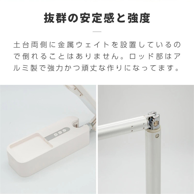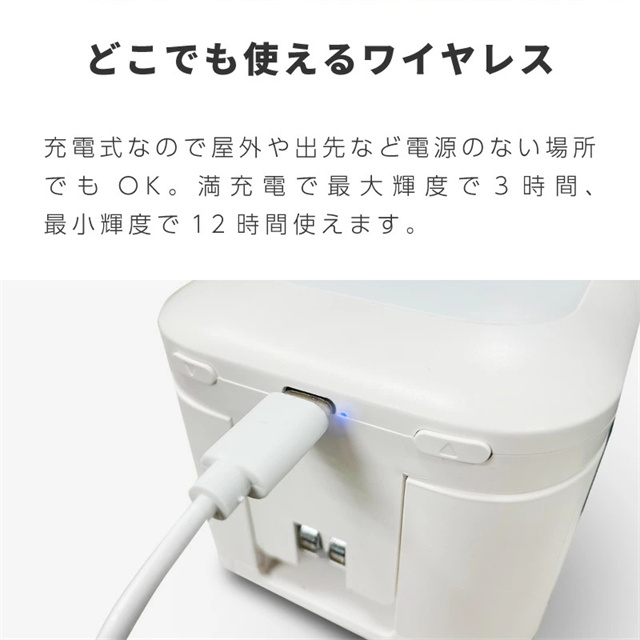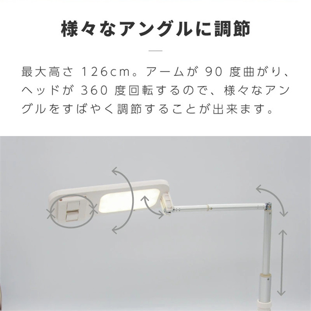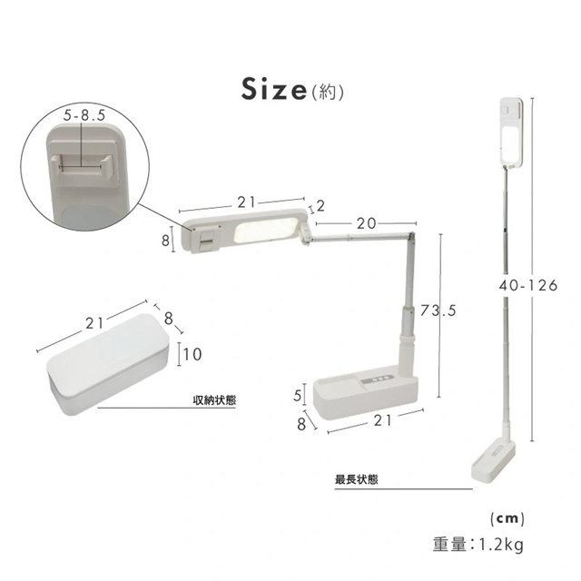 ■ 収納状態サイズ:21cm×8cm×10cm ■ アーム長さ:40-126cm ■ 重量:1.2kg ■ LED:7段階調節 ■ 充電時間:約2時間 ■ 連続点灯時間:最大輝度3時間、最小輝度12時間 ■ 電源:USB |