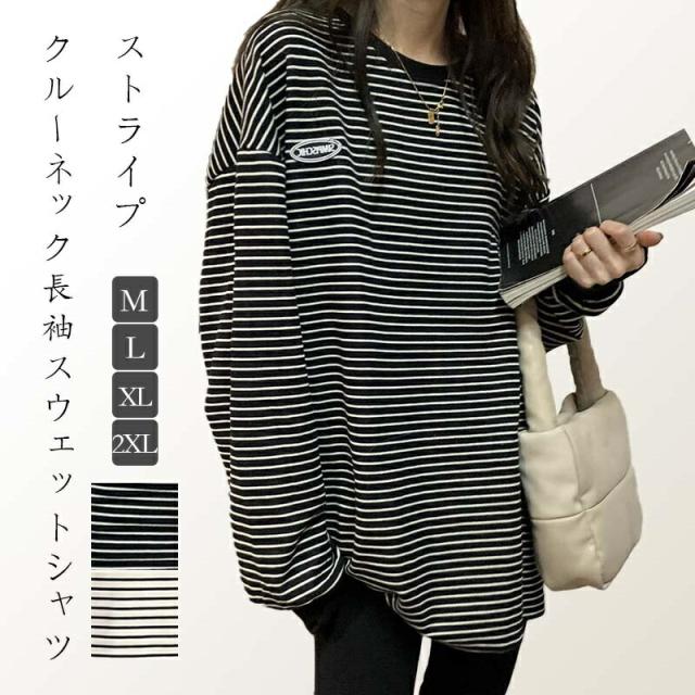 長袖 チュニック シャツ 春秋 きれいめ プルオーバー ゆったり 普段使い 白 黒 薄手 伸縮性 クルーネック ボーダー プリント リブ トップス レディース 大きいサイズ ドロップショルダー ボリューム袖 オーバーサイズ ビッグシルエット ボーダー