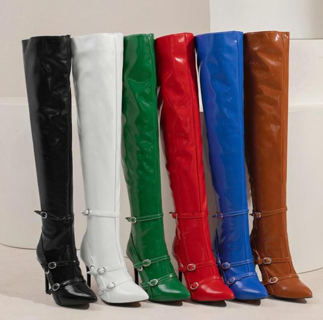 レディースブーツニーハイブーツエナメル10.5センチ超ハイヒール光沢ロング丈秋冬春秋サイハイブーツ大きいサイズ29cmまで