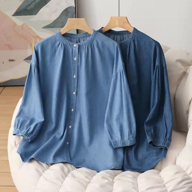 シャツ ブラウス レディース 七分袖 トップス 夏 夏服 ゆったり 夏シャツ デニム デニムシャツ デニムブラウス ノーカラー 柔らかい 着痩せ 薄手 夏ブラウス おしゃれ オシャレ きれいめ 無地